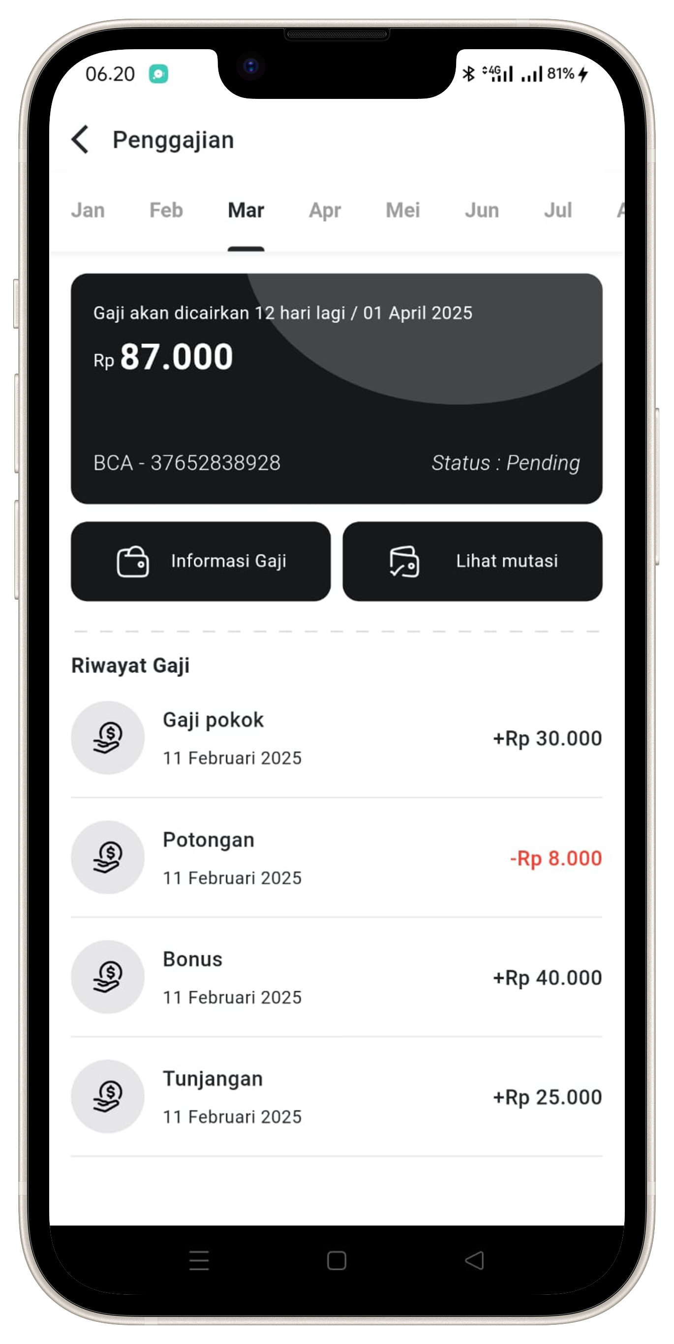 Tidak perlu repot hitung manual. Dengan sistem yang terintegrasi, gaji karyawan akan dihitung otomatis berdasarkan kehadiran mereka — lebih cepat, lebih tepat, dan minim kesalahan.